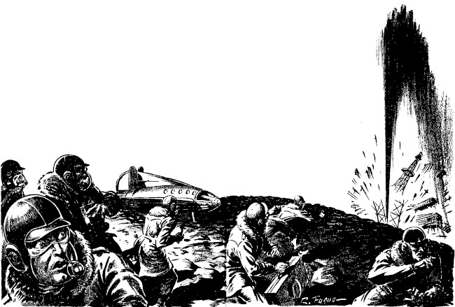 Biggs didn't answer him. He didn't have to. For at that moment there rose a sudden warning shout from where our workers tended the diamondhead drill. Voices raised in swift alarm, from the ground beneath our feet came a strange roaring, rushing, gushing sound. And even as the workmen fled, the superstructure of our drill shattered and flew high into the thin air of Iris—borne aloft on a pillar of thick black goo!